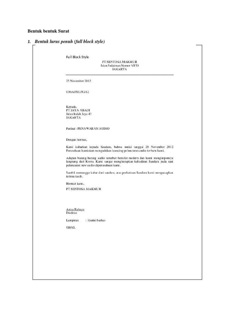 bentuk setengah lurus (semi block style), sebenarnya sama dengan bentuk surat lurus, perbedaannya terletak pada penulisan isi surat dan tiap alinea baru menjoraok (masuk ke dalam). Pada praktiknya, surat dengan bentuk ini banyak dipergunakan oleh perusahaan. Contoh surat semi block style. surat lurus (block style) style surat yang satu ini tidak jauh beda dengan bentuk pertama. The form letter like this is made for people who read it focused on the principal letter to letter. Contoh format surat bentuk setengah lurus semi block style kejuruan. Cute766.info karya indah jalan raden saleh 14 bandung tuan yang terhormat membalas surat tuan satu minggu yang lalu dengan ini kami kabarkan bahwa laporan dari ahli pemeriksa buku dagang kami telah mengirimkan kepada tuan satu. bentuk surat yang paling umum digunakan salah satunya adalah bentuk full block style atau bisa juga disebut bentuk lurus penuh. bentuk lurus bentuk lurus pada dasarnya hampir sama dengan bentuk lurus penuh. Untuk menulis surat terdapat berbagai bentuk surat secara resmi yang dapat digunakan. Untuk lebih jelasnya, perhatikanlah keenam macam bentuk surat beriku t ini. Contoh surat full block style bentuk surat ini disebut juga dengan surat bentuk lurus penuh. Mengenal pengertian surat full block style.